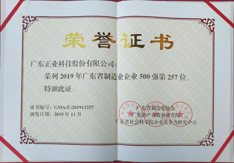 正業(yè)科技榮列“2019年廣東制造業(yè)企業(yè)500強”榜單,這充分彰顯了公司在制造領(lǐng)域深耕細作,所表現出來(lái)的卓越綜合實(shí)力和強大市場(chǎng)競爭力。