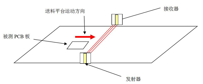 利用非接觸式影像測量技術(shù),通過(guò)一對高精度激光位移傳感器,包括一個(gè)接收裝置和一個(gè)發(fā)射裝置,當覆銅板或PCB板經(jīng)過(guò)這對位移傳感器時(shí),有板的地方將會(huì )阻擋發(fā)射裝置發(fā)射的信號,從而在接收裝置上無(wú)法響應相應位置的信號。