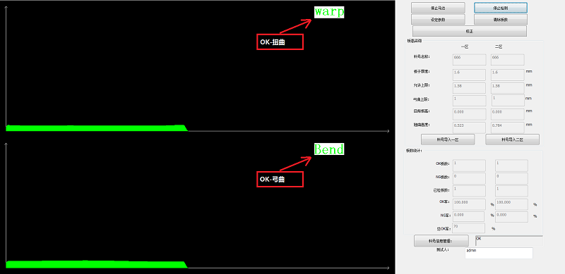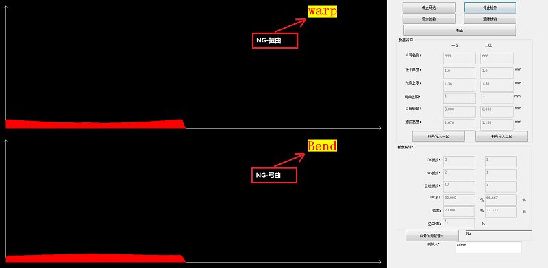 通過(guò)位置的信息可以得到PCB板的板厚曲線(xiàn)圖,通過(guò)特定軟件算法和翹曲度定義,計算出板翹曲度,并根據設定判斷條件得出OK和NG板。