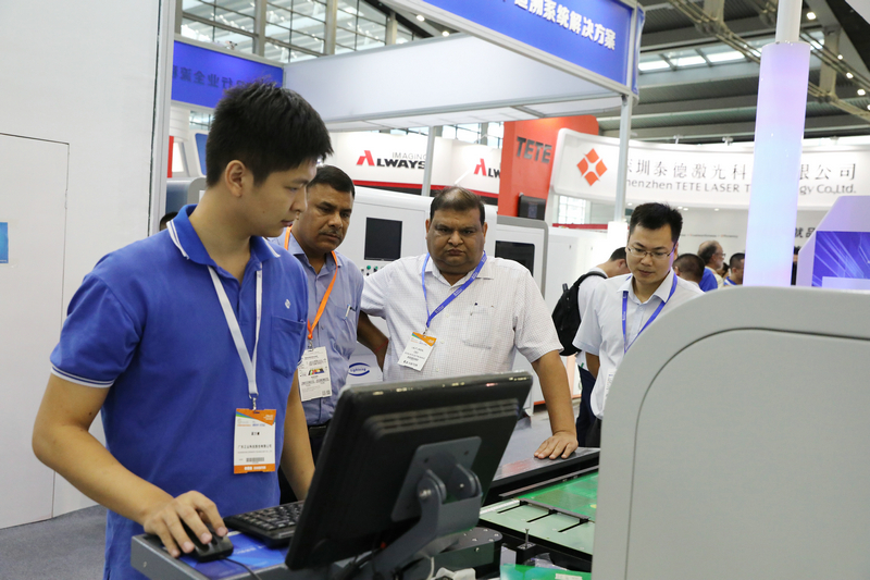 ▲技術(shù)人員為客戶(hù)講解PCB全自動(dòng)二維碼激光打標機
