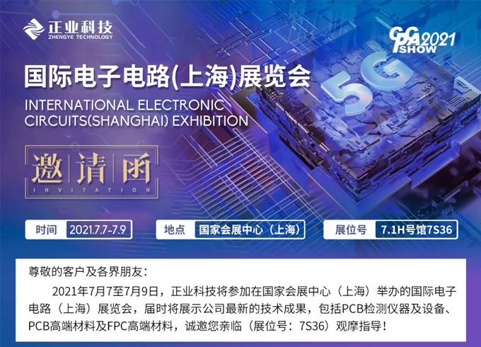 2021年7月7至7月9日,正業(yè)科技將參加在國家會(huì )展中心(上海)舉辦的國際電子電路(上海)展覽會(huì ),屆時(shí)將展示公司最新的技術(shù)成果,包括PCB檢測儀器及設備、PCB高端材料及FPC高端材料,誠邀您親臨(展位號:7S36)觀(guān)摩指導!